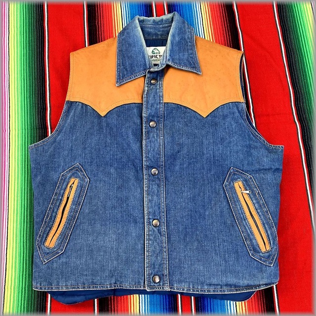 ★PACIFIC TRAIL Sportswear パシフィックトレイル 80s デニム ダウンベスト レザーヨーク 涙タロン size XL★検索 ビンテージ アメリカ 古着
