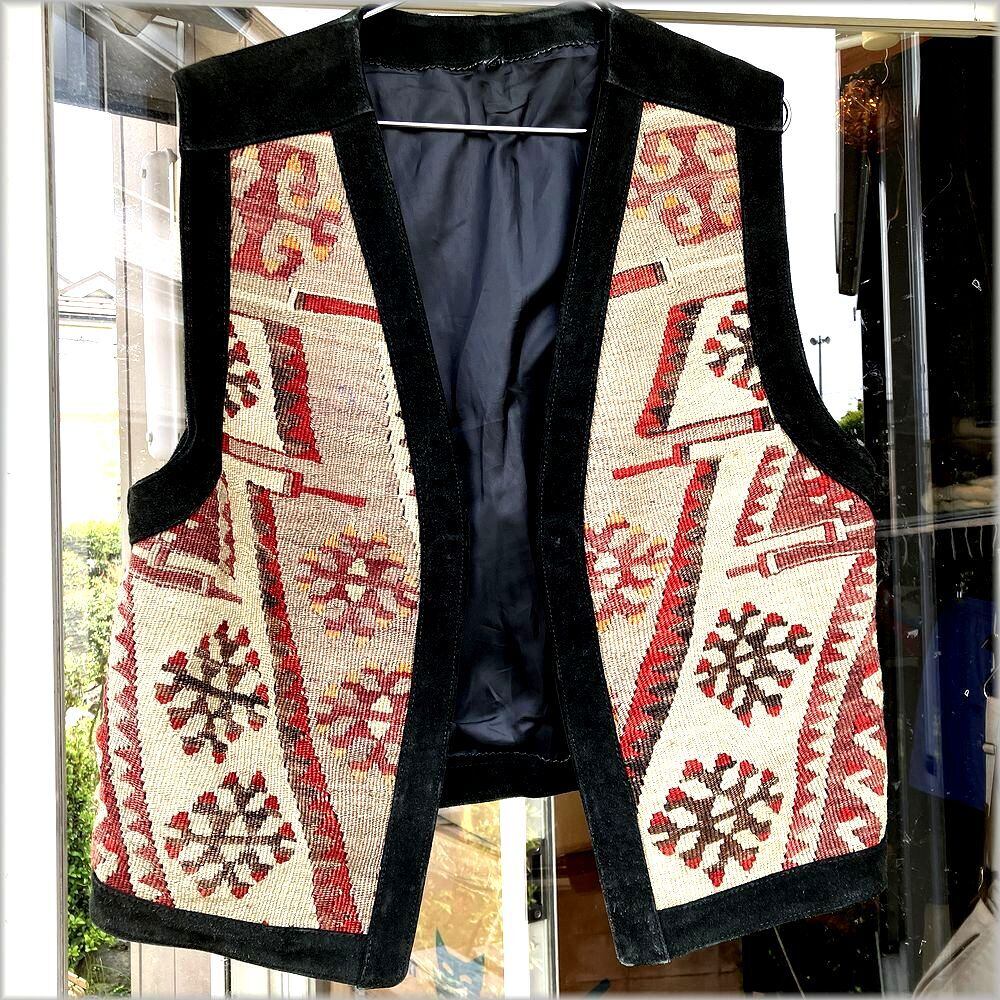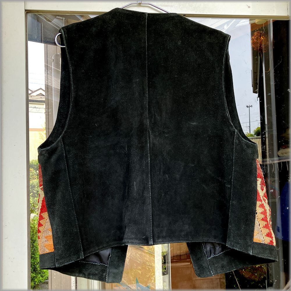 ★80s 90s トルコ製 ベスト ブラックスエード ブランケット★検索 ビンテージ 民族柄 ネイティブ柄 ジャケット 古着