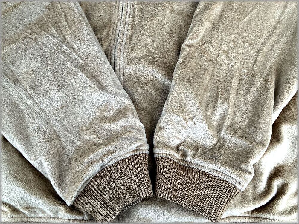 素材はポリエステルで、片方はフェイクスエードのような感じで、もう一方も起毛系の生地です。