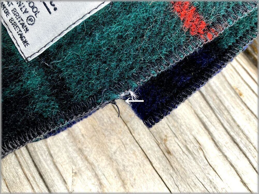 まだプラスチックのタグが付いた未使用デッドストックです。画像矢印先に少しステッチの解れがあります。全体的に良好な状態です。