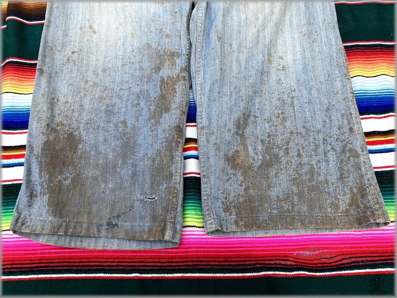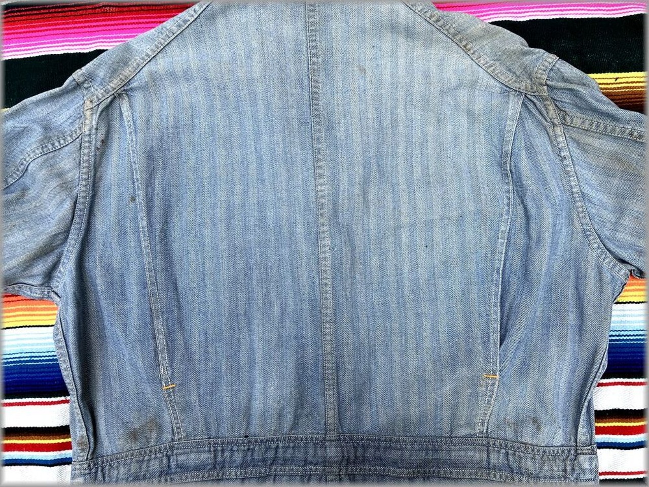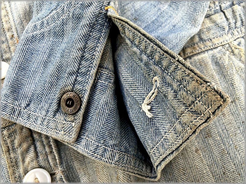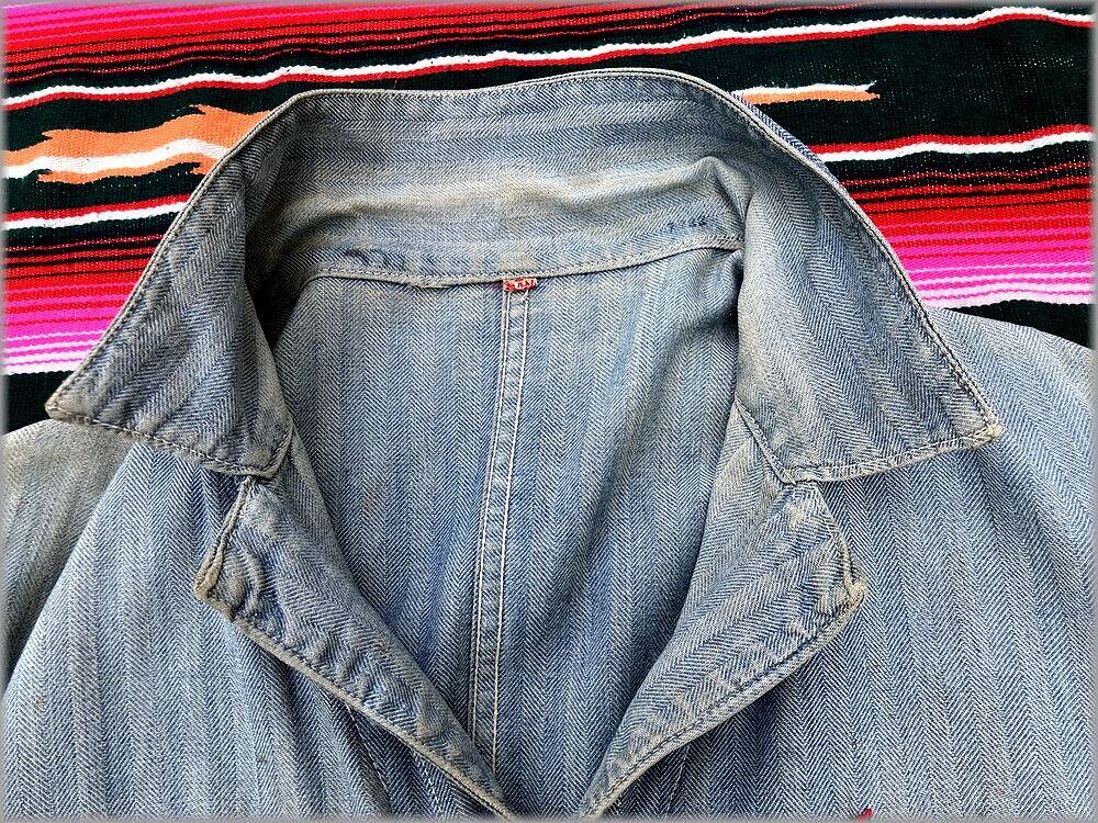 USEDです。タグは欠損しています。フロントのボタンは交換されています。一番上のスナップボタンはバカになっていて、留めることができないです。(正確に言うと留められないことはないですが、留めづらく非常に緩いです)全体的に汚れがあります。リペアやダメージがあります。以上のような状態ですので、状態が心配な方は店頭でご確認ください。