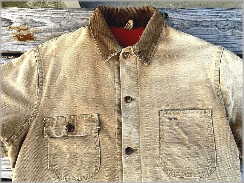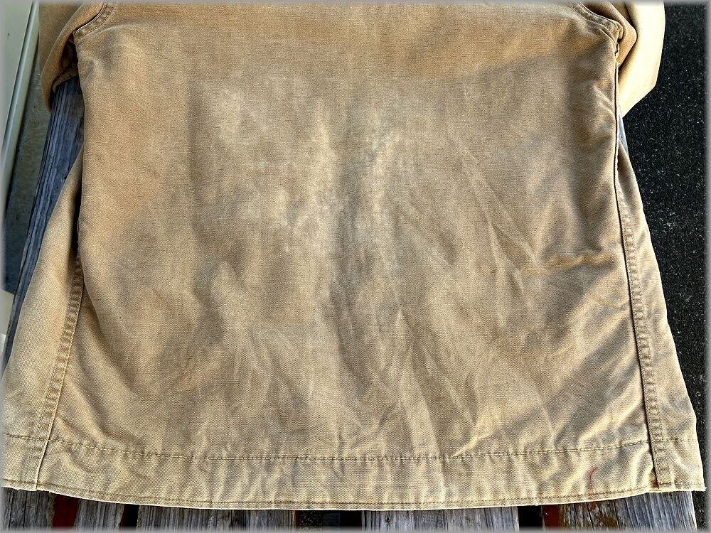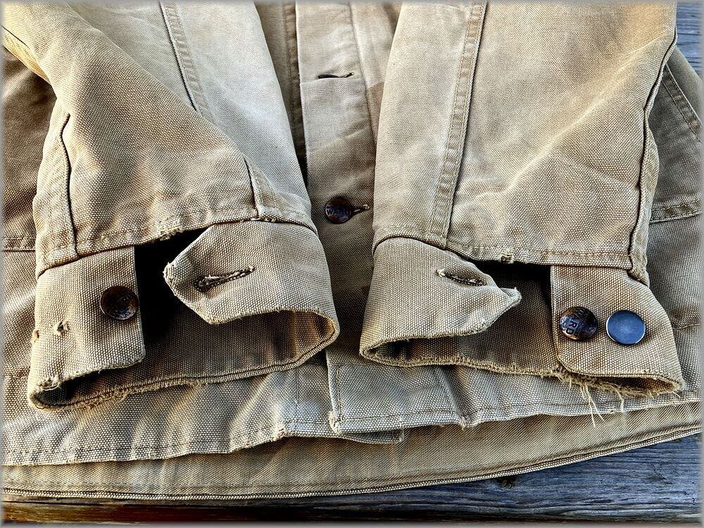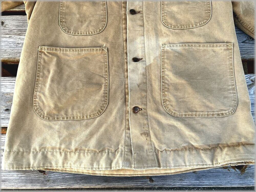 USEDです。袖ボタンはオリジナルで2個付いているはずですが、右袖は1個欠損していて、左袖は1個交換されています。裏地のキルティングのステッチの解れが見られます。主に袖先や裾に擦れたイタミがあります。ボディにフェードや汚れがあります。USEDの良い雰囲気が出ていて問題無く着用いただける状態かと思いますが、状態が心配な方は店頭でご確認ください。