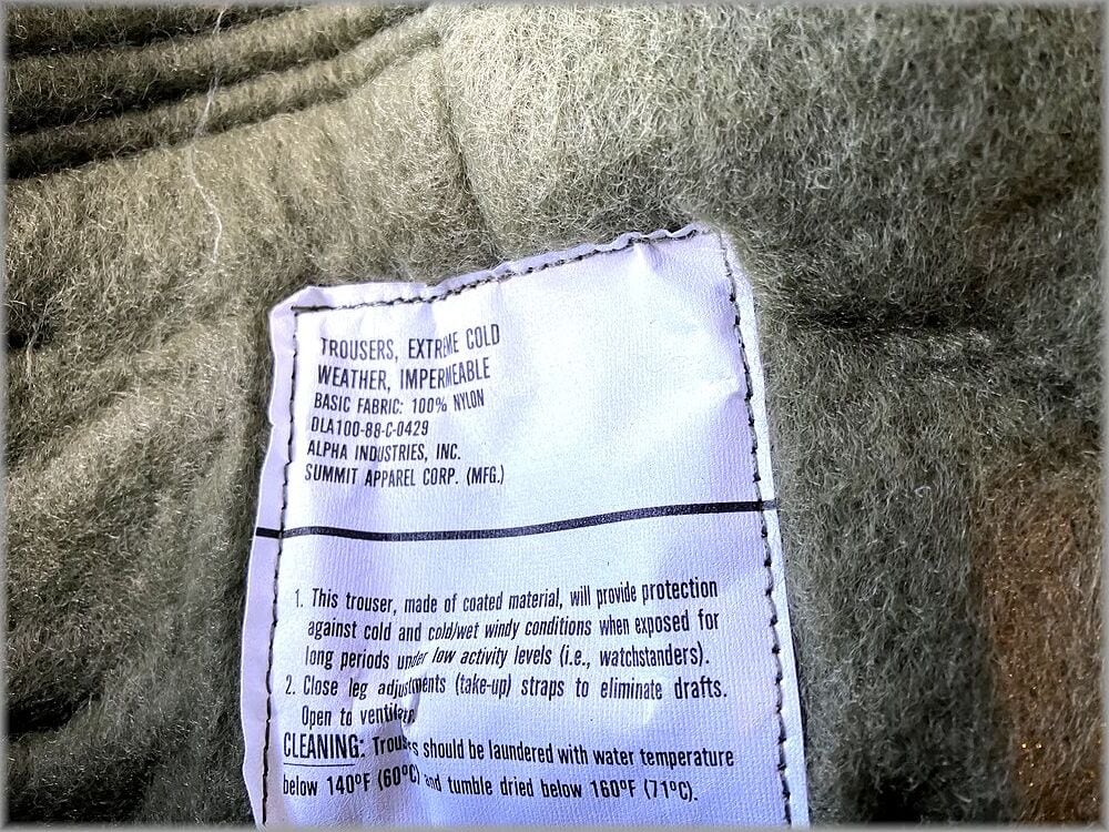 88年 米軍 US NAVY TROUSERS, EXTREME COLD WEATHER, IMPERMEABLEデッドストックです。コントラクタ―はSUMMIT APPAREL CORP.です。ジッパーはスコービルです。