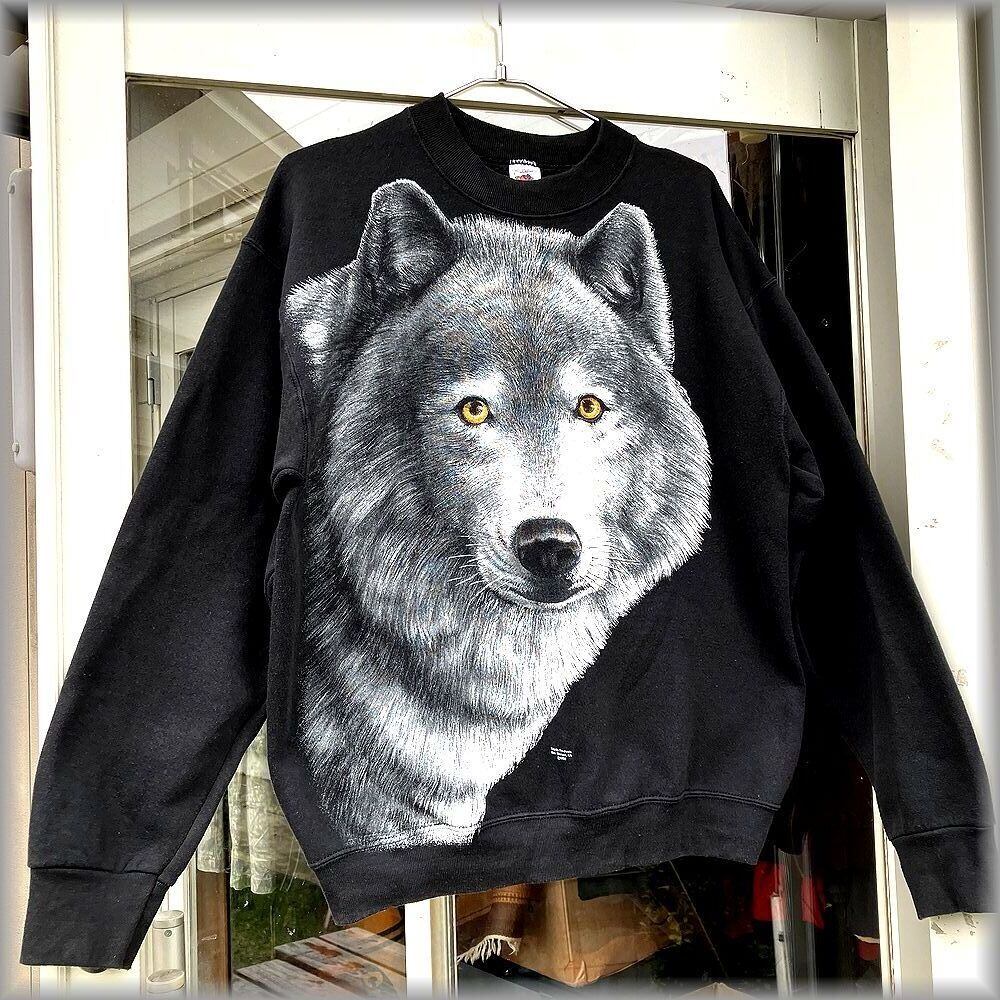 ★90s USA製 アニマルプリント 犬 オオカミ スウェット トレーナー Trinity Products size L ブラック 黒 フルーツオブザルーム★検索 ビンテージ