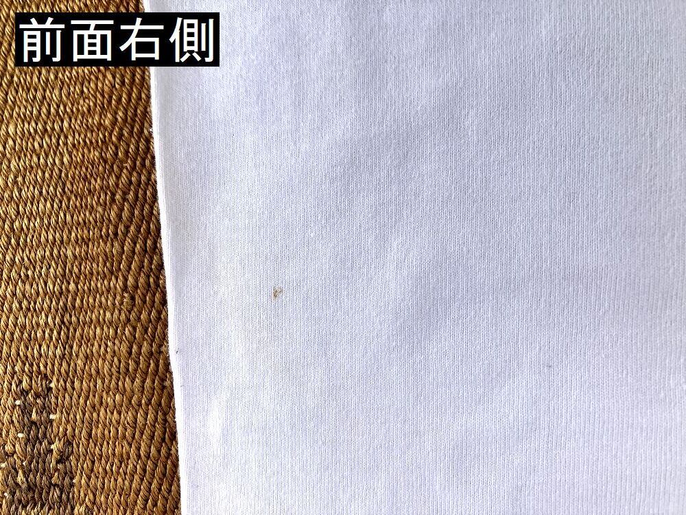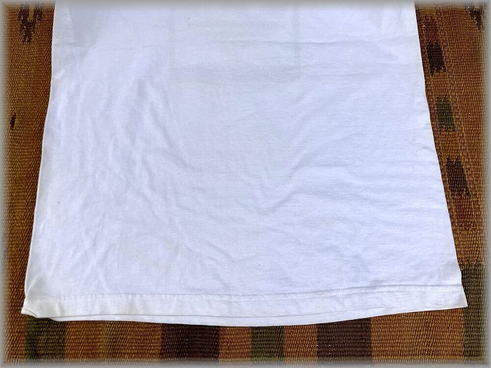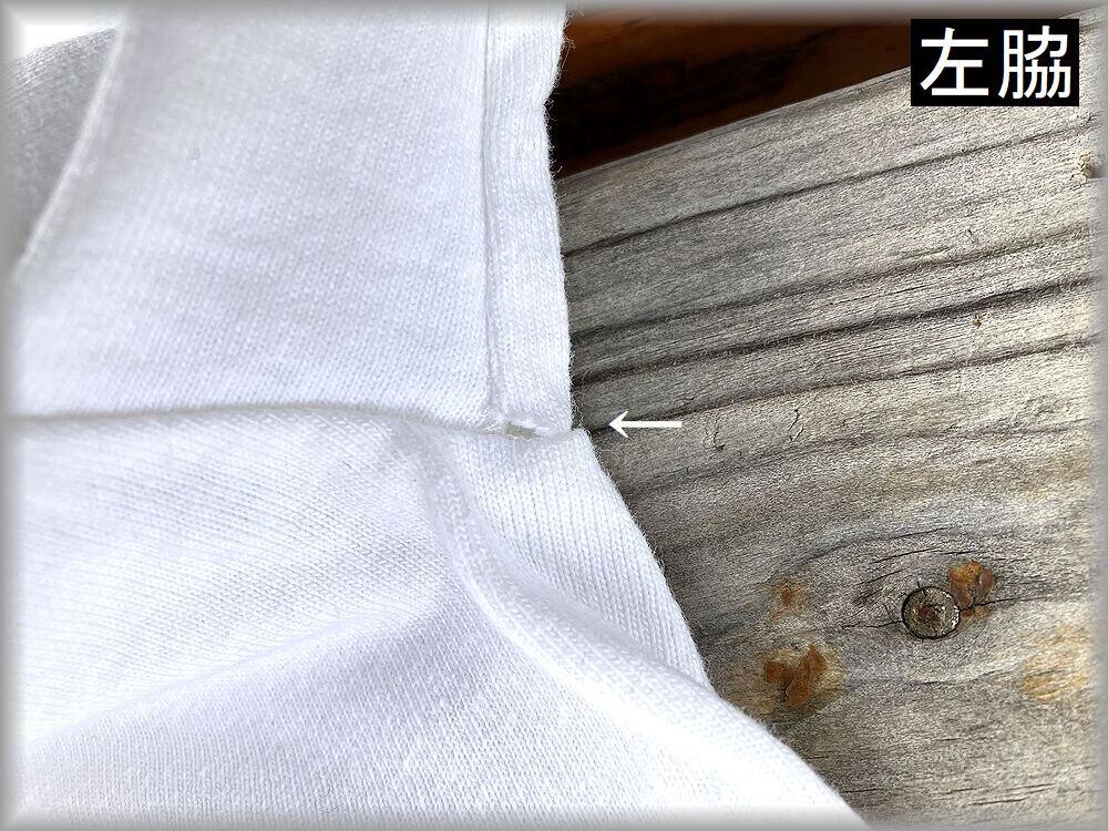 デッドストックです。古い物なので店頭の新品のような100%の状態ではないのでご了承ください。左脇に画像の解れがあります。(画像矢印先)保管による薄い汚れがあります。汚れは目立つ程ではなく漬け置きなどして洗えば落ちる程度かなと思うので、古い物に慣れている方なら問題無く着用いただける状態かと思いますが、状態が心配な方は店頭でご確認ください。