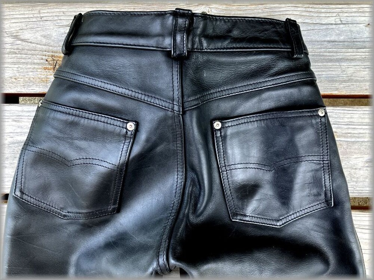 USEDです。レザーに擦れやキズがあります。(主な部分は画像参照)裾は切りっぱなしになっています。まだレザーはしっかりめです。状態が心配な方は店頭でご確認ください。