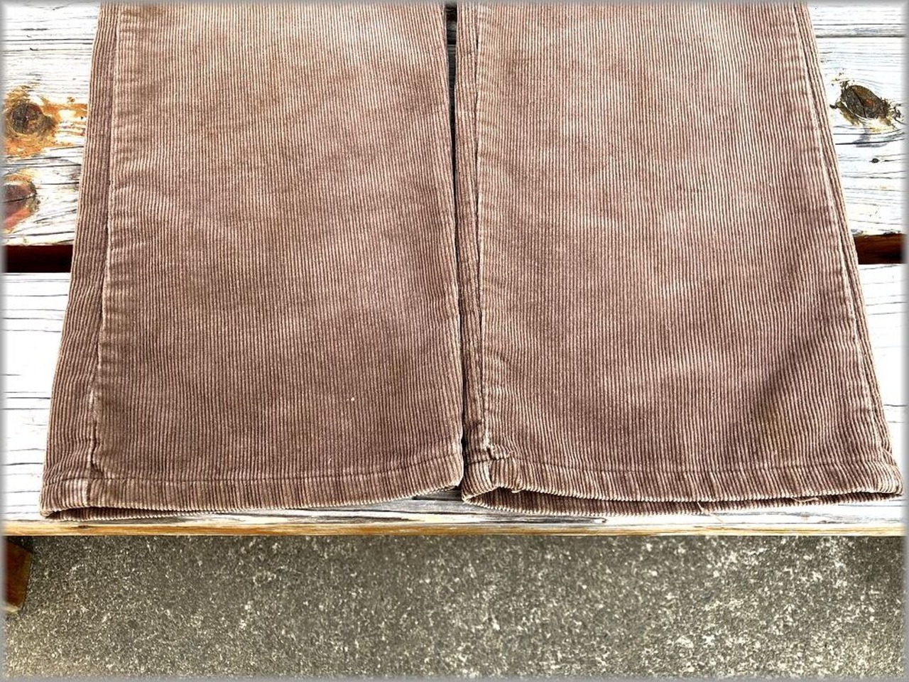 USEDです。コーデュロイに薄く汚れがあります。パッと見は目立つ程ではないですしコーデュロイもしっかりしているので、USEDとしては問題無く着用いただける状態です。大まかな部分の画像は載せておきましたが細かい汚れは確認しずらいので、状態が心配な方は店頭でご確認ください。店頭ではパンツハンガーにかけていますので、コーデュロイにパンツハンガーの跡があります。(ウォッシュしていけば消えていきます)