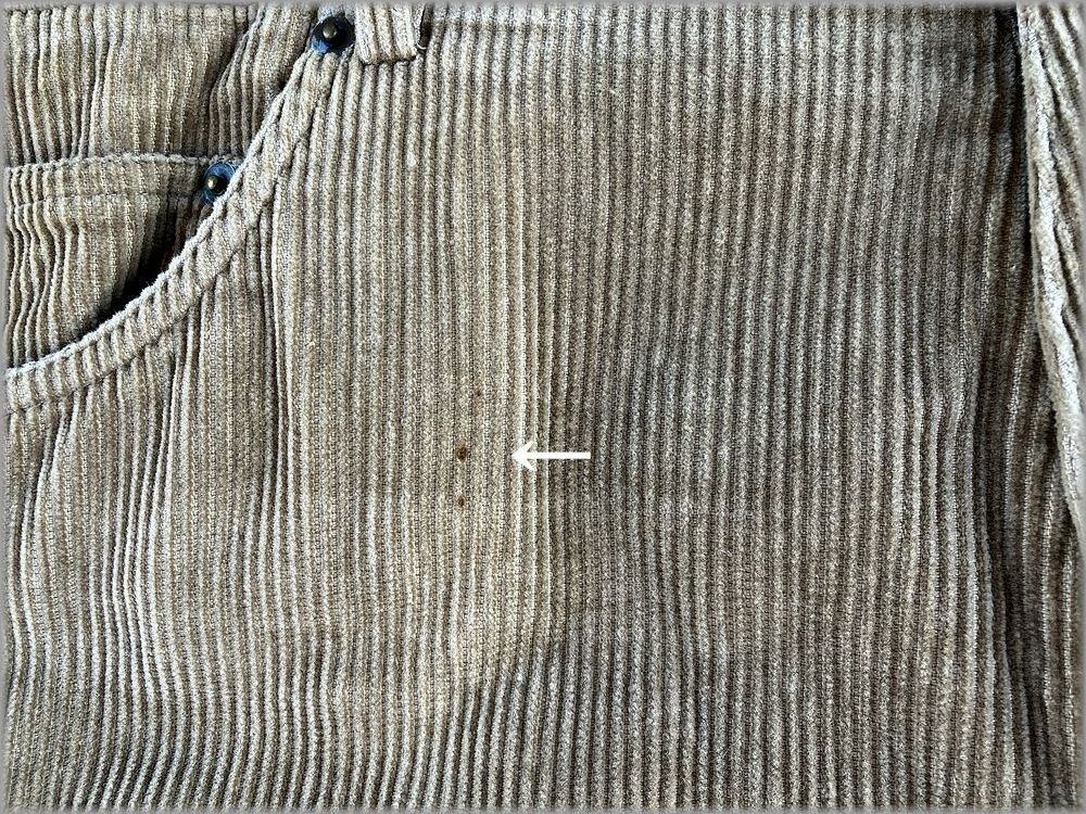 USEDです。画像のような軽い汚れがあります。腰のレザーパッチの下のステッチに一部解れがあります。USEDとしては問題無く着用いただける状態です。