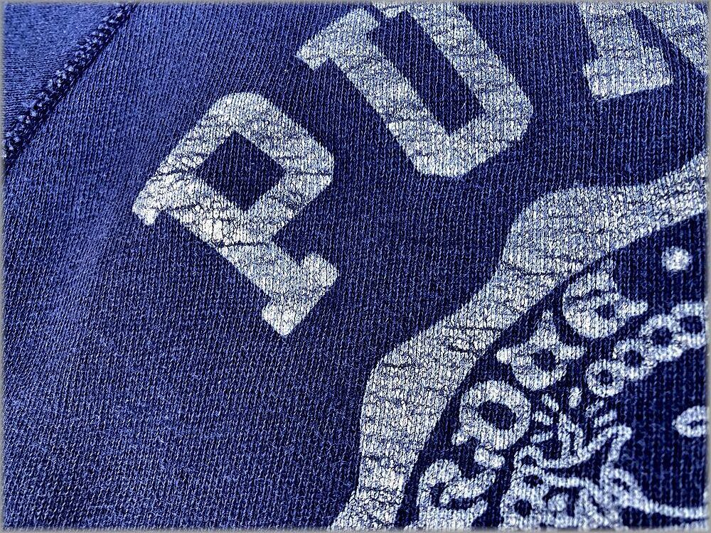 USEDです。プリントは多少薄くなっています。ボディに多少のフェードがあります。目立つようなダメージや汚れはありません。生地もまだ少し肉厚感・裏地のフカフカ感は残っています。ビンテージ物としては問題無く着用いただける状態です。