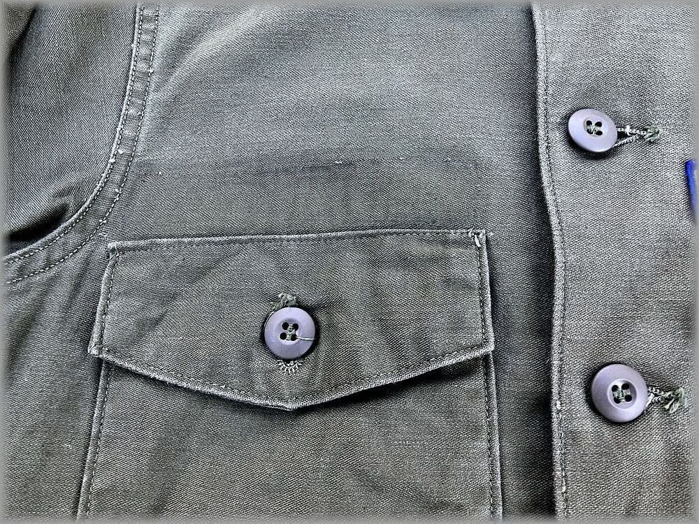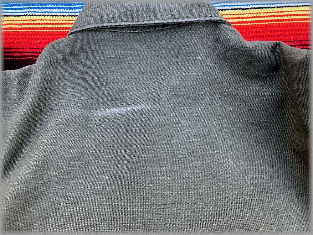 USEDです。右胸ポケット上にワッペンを剥がした跡があります。背面にハンガーで擦れた跡があります。全体的に生地はまだしっかりしています。