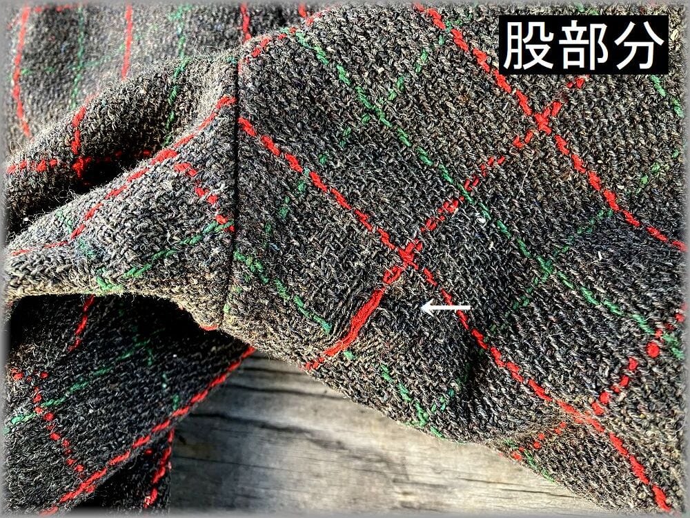 USEDで使用感あります。スレーキ(ポケットの布)など内側の白い生地に少し汚れがあります。股部分に画像矢印先のリペアがあります。目立つような問題はなくビンテージ物としては問題無く着用いただける状態ですが、状態が心配な方は店頭でご確認ください。