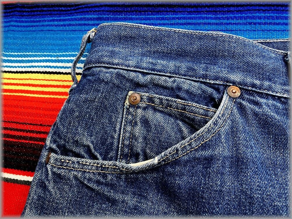 腰のパッチは欠損していますが、ヒップポケットのピスネームは白いタイプで、馬に乗ったカウボーイのパッチが付いていたかと思います。