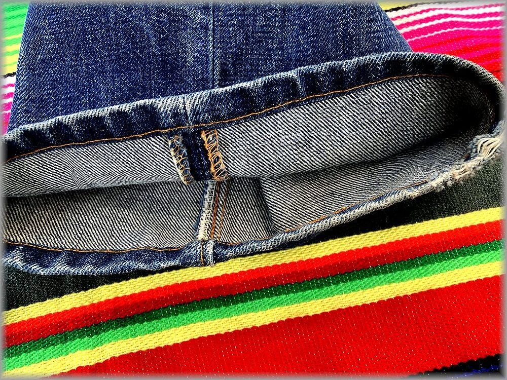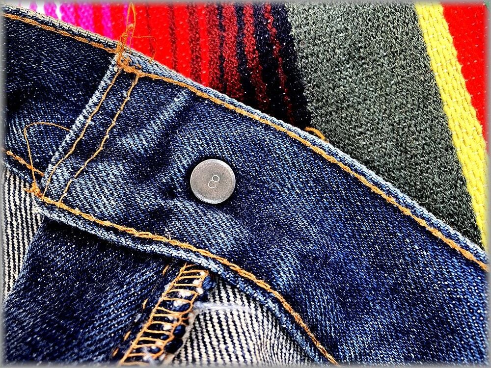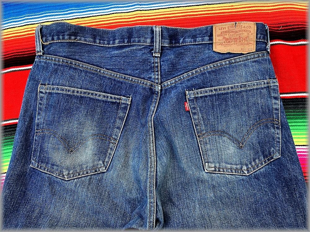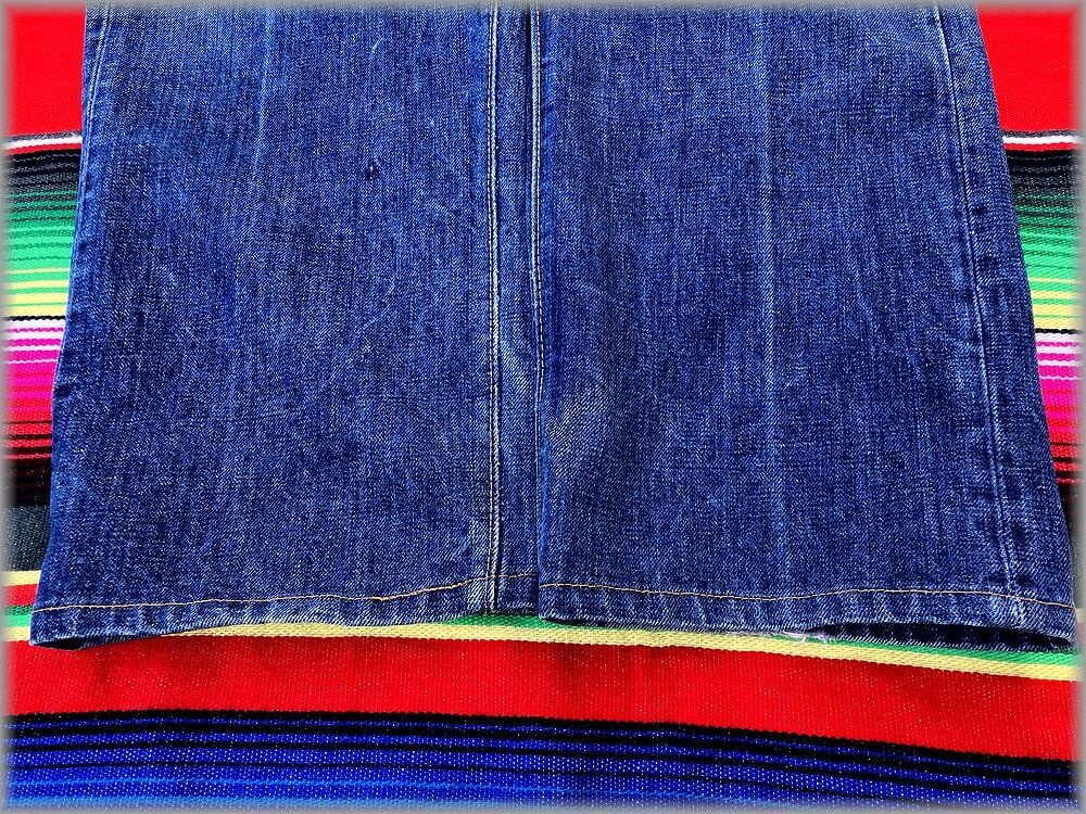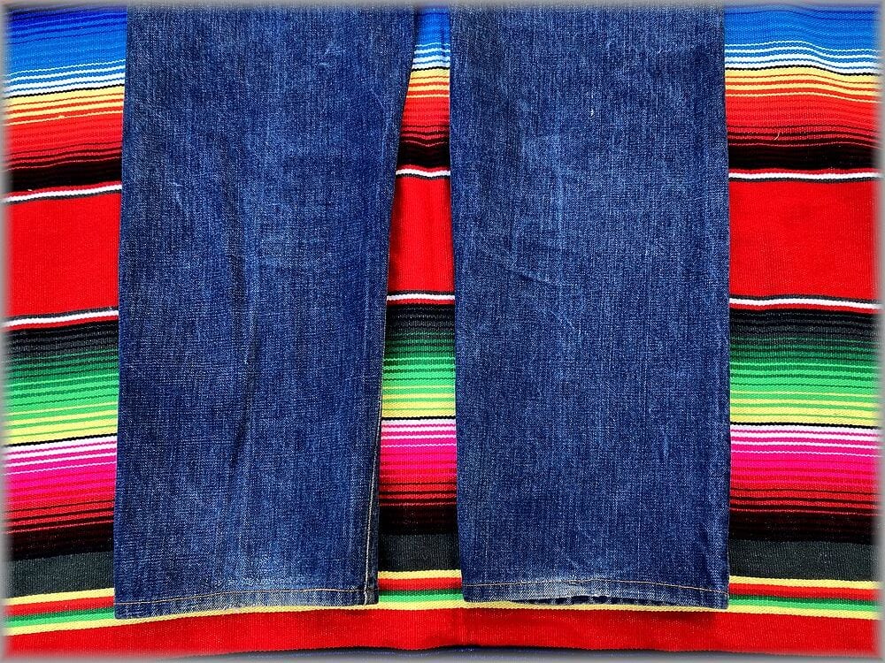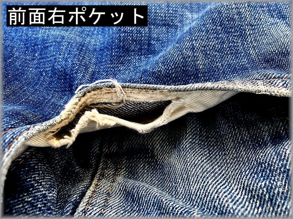 USEDです。濃淡はありますが、デニムの色は全体的に濃いめに残っています。縦落ちしていてビンテージの良い雰囲気のデニムです。主にフロント右ポケットや裾に擦れたダメージはありますが、目立つような問題はありません。ビンテージ物としては良好な部類の状態かと思いますが、状態が心配な方は店頭でご確認ください。