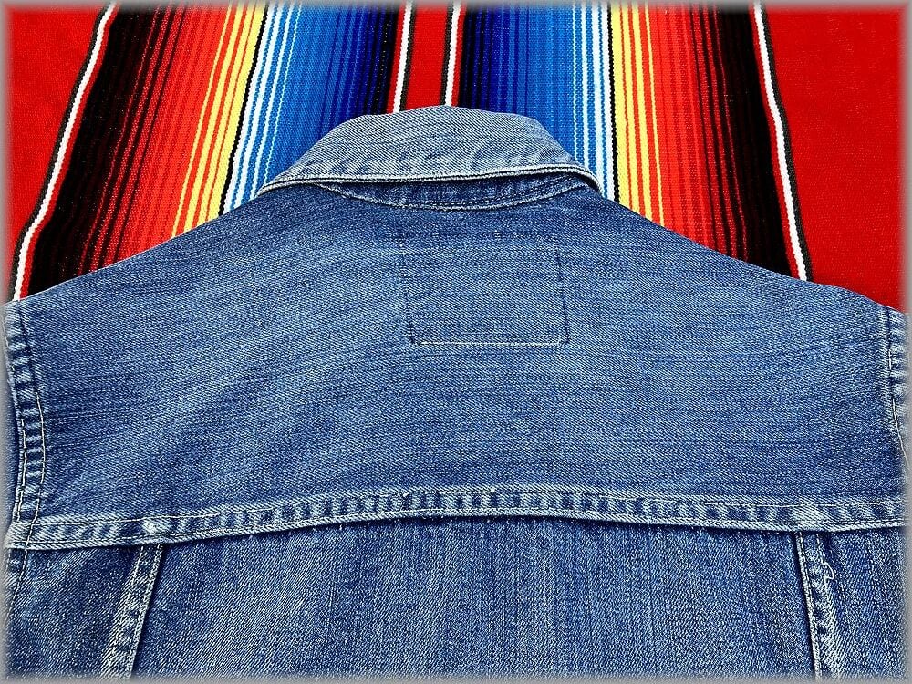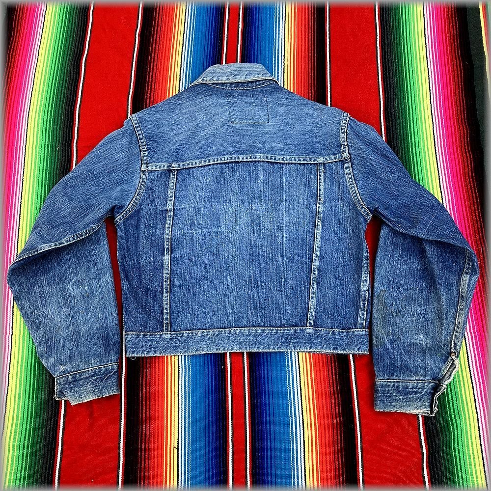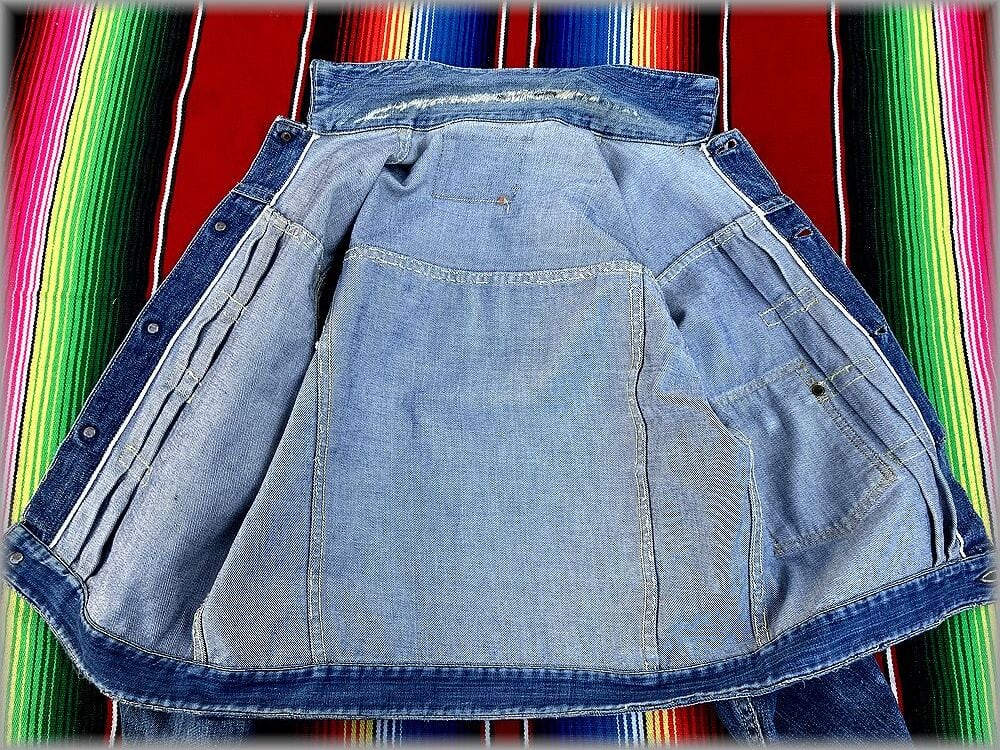 USEDです。パッチは欠損しています。デニムは濃くはないですが、程良く残っているかなと思います。襟にダメージ、袖口辺りにも少し擦れたダメージがあります。左袖に汚れがあります。大まかな部分はなるべく画像を載せてありますのでご確認ください。一つ一つ細かい状態を説明するのは難しいので、状態が心配な方は店頭でご確認ください。