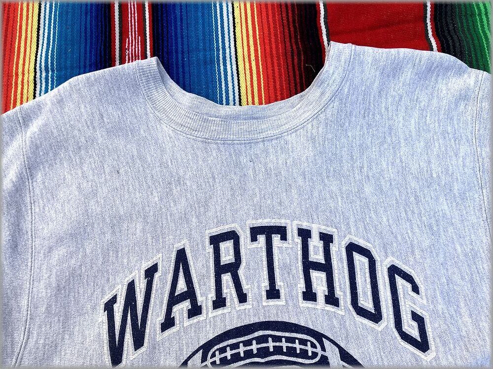 ★Champion チャンピオン 90s USA製 刺繍タグ リバースウィーブ 3段プリント WARTHOG FOOTBALL 霜降りグレー 杢 size L★検索 ビンテージ スウェット トレーナー アメリカ 古着 カレッジ