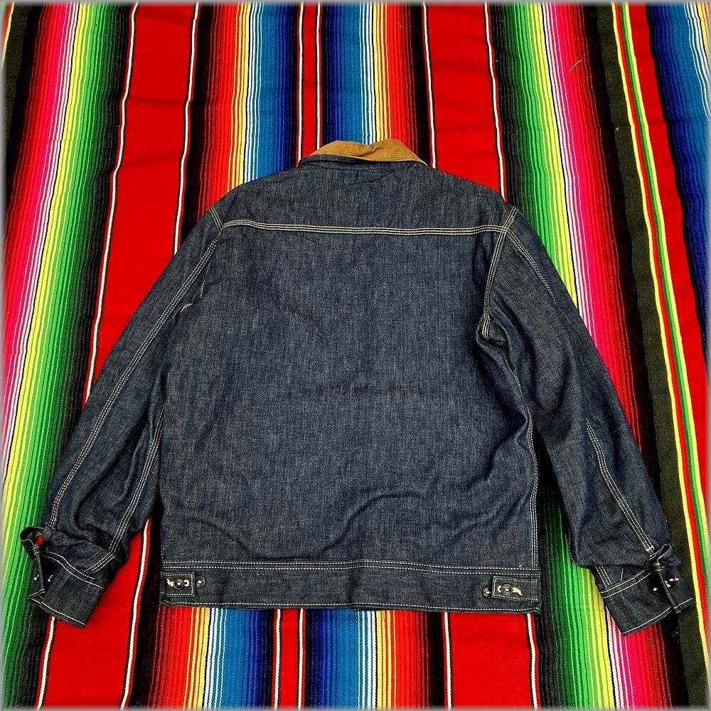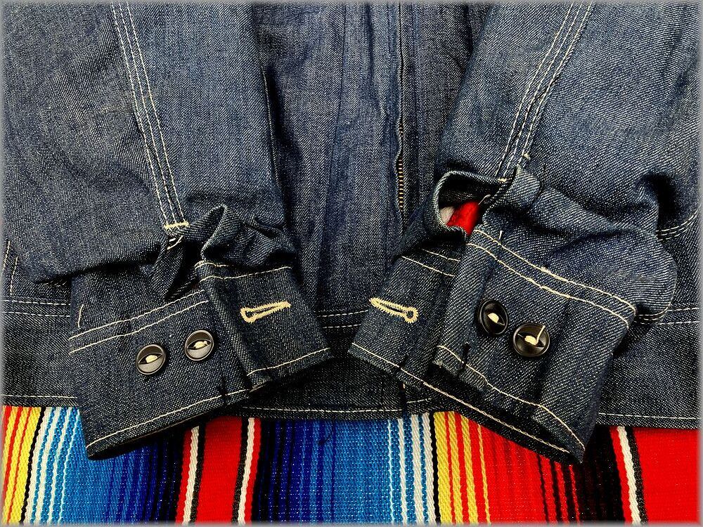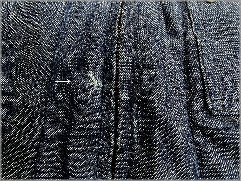 デッドストックかそれに近い状態です。水は通っていなく、襟も着用感がありません。ただ前面中央辺りに擦れたような少しデニムの色が落ちている部分があります。全体的にキレイな状態です。