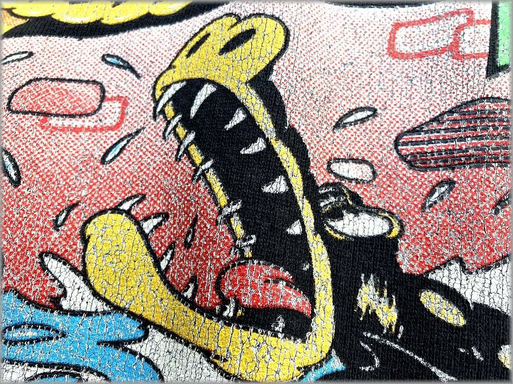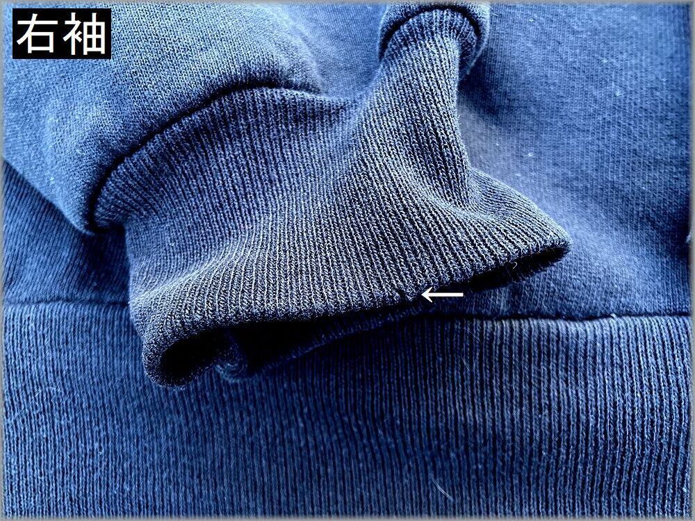 USEDで使用感あります。プリントの細かいひび割れがあります。右袖リブに画像矢印先の小キズがあります。目立つような問題はないので、USEDとしては問題無く着用いただける状態です。状態が心配な方は店頭でご確認くさい。