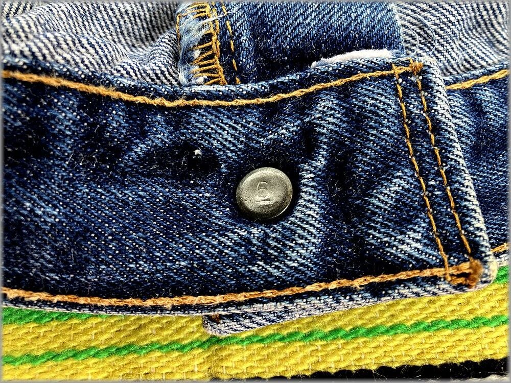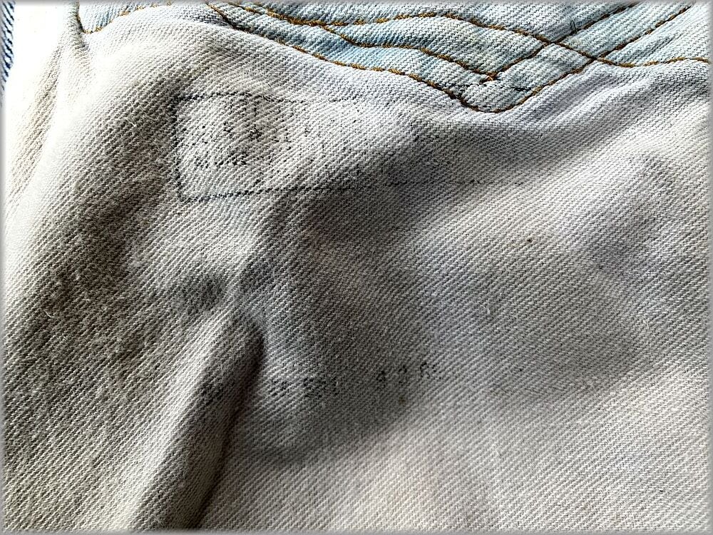 トップボタン裏の数字は6で、ヒップポケット裏のステッチはシングルです。